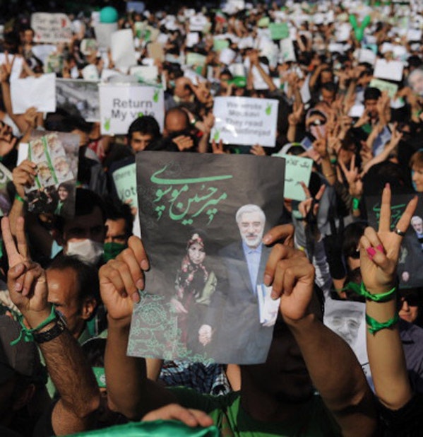 Demonstrators carry banners and pictures of Mir Hossein Mousavi, the defeated reformist candidate, during a march on Karimkhan Street, Tehran, June 17, 2009. (Kaveh Kazemi/Getty Images)